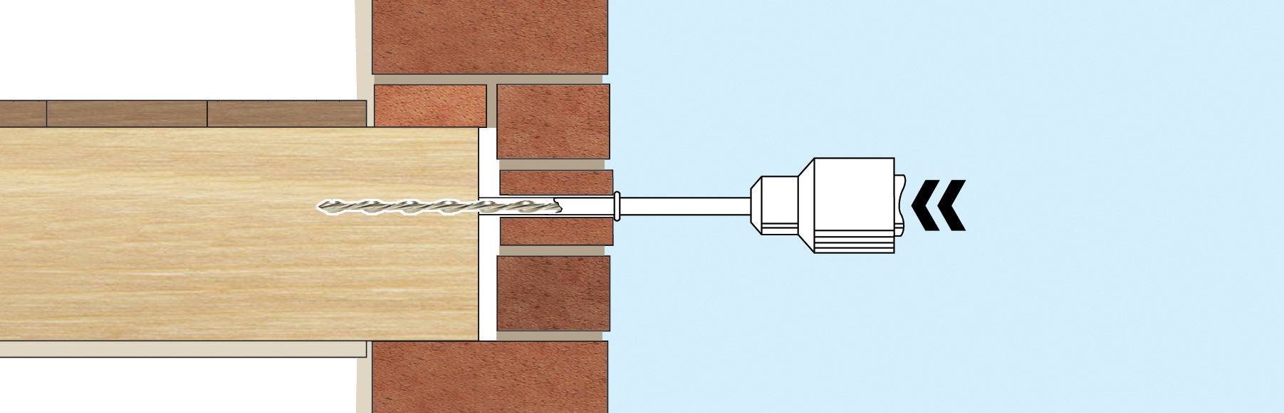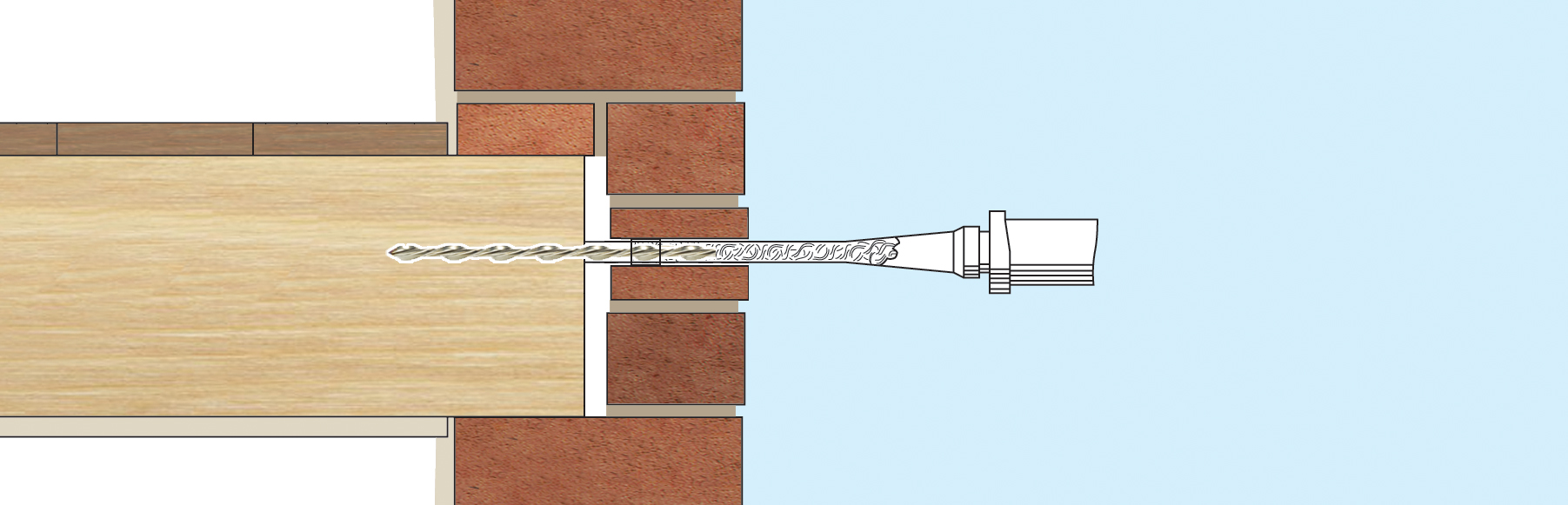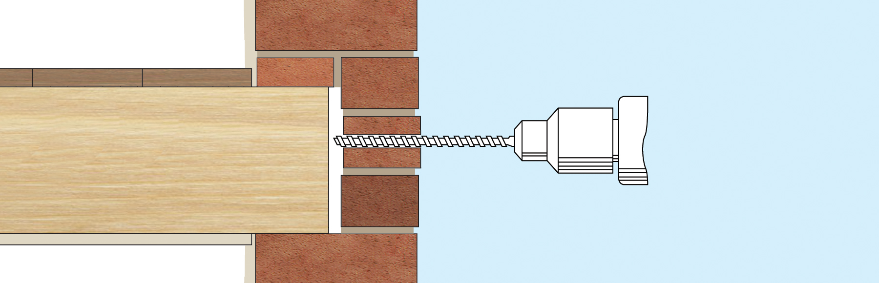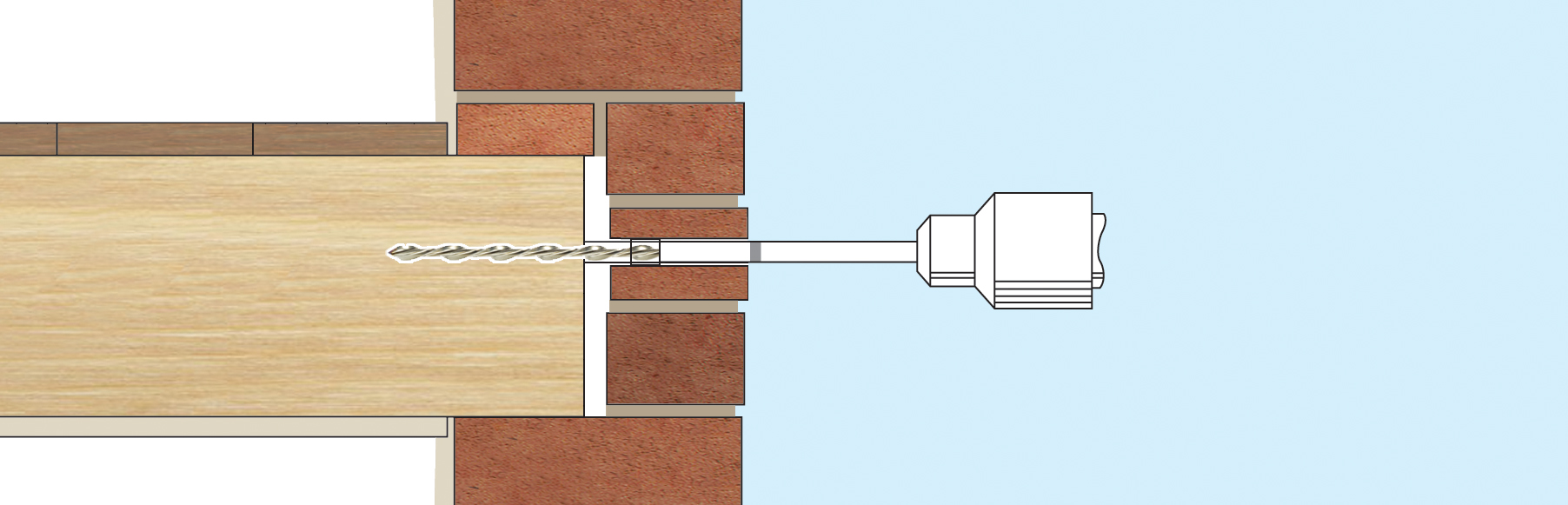 1. Mark the position of the joist centre on the external wall and then drill a clearance hole (normally ½”) through the wall (and first joist if parallel to the wall). Clean out the hole.