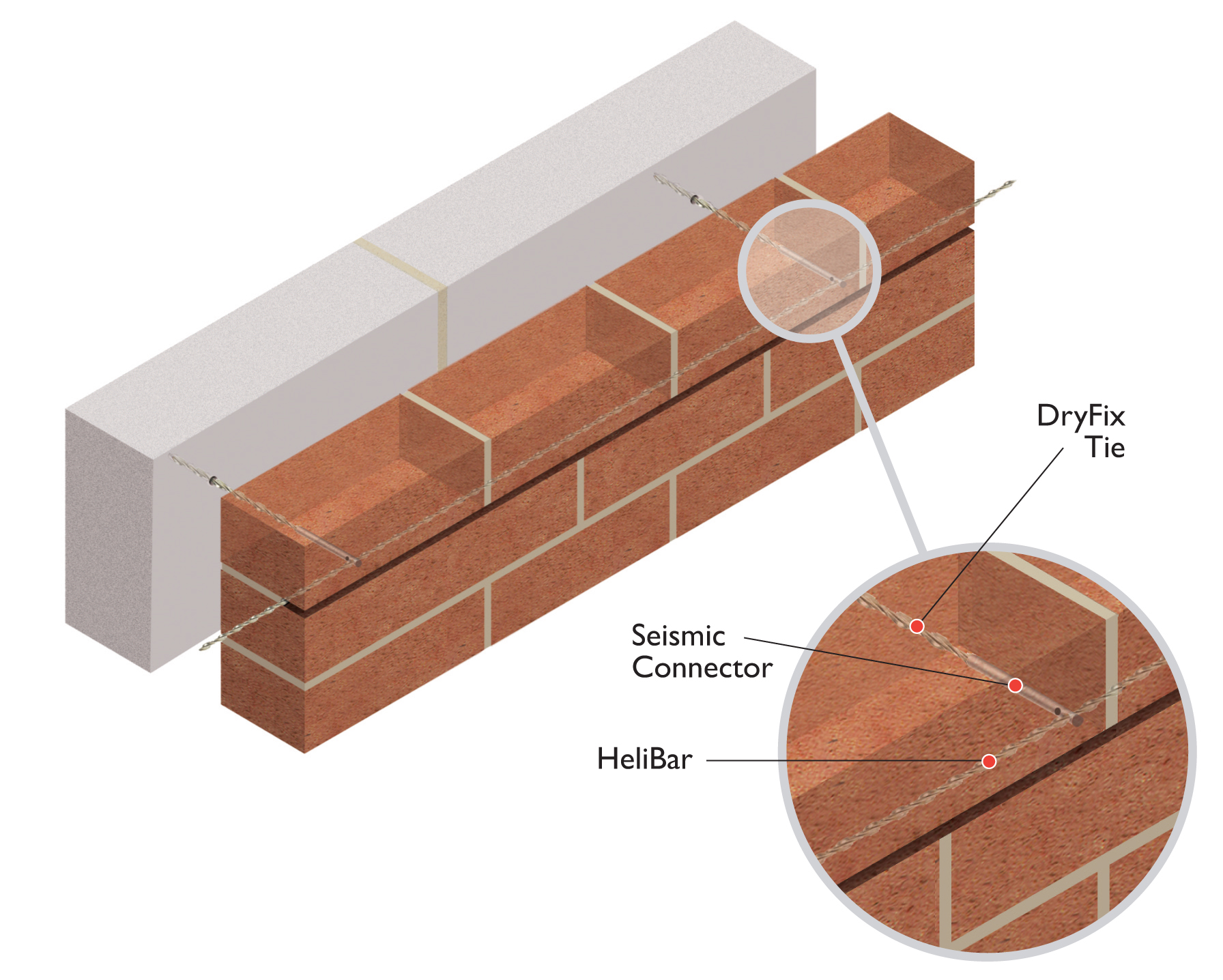 Seismic Connectors enable buildings to meet current seismic standards and restore structural performance. The DryFix system is used in conjunction with a special Seismic Connector fitted to the tie end and connected laterally with HeliBar 4.5mm diameter stainless steel wire which is embedded into the outer wythe mortar. The system is used to strengthen cavity wall constructions in both new build and retrofit applications.