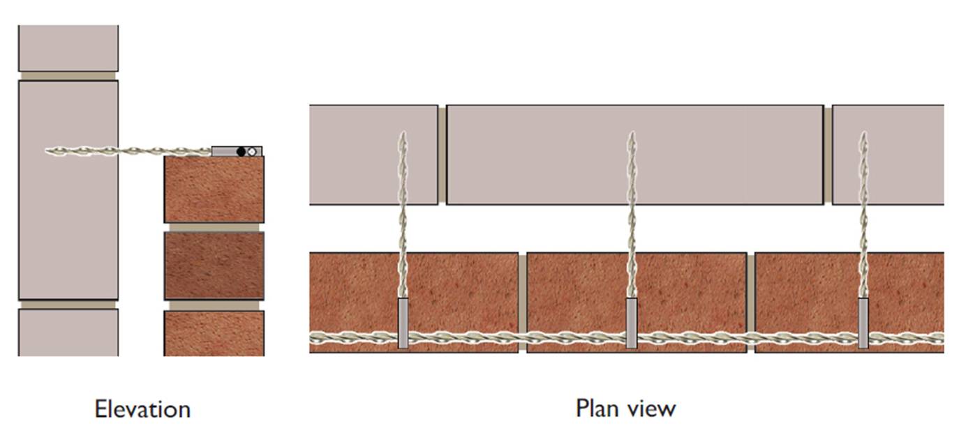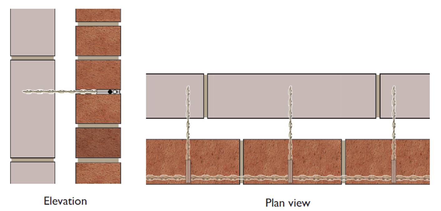 In remedial situations the DryFix ties are installed, in the standard manner, through the ‘T’ joint of the outer wythe mortar. The seismic connectors are fitted and then threaded together with HeliBar which is inserted into the channeled-out mortar joint and grouted in place.
